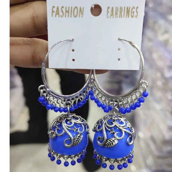 - Navy blue and silver-toned circular bali style jhumka Earrings, this earring is beautifully crafted with artificial beads and